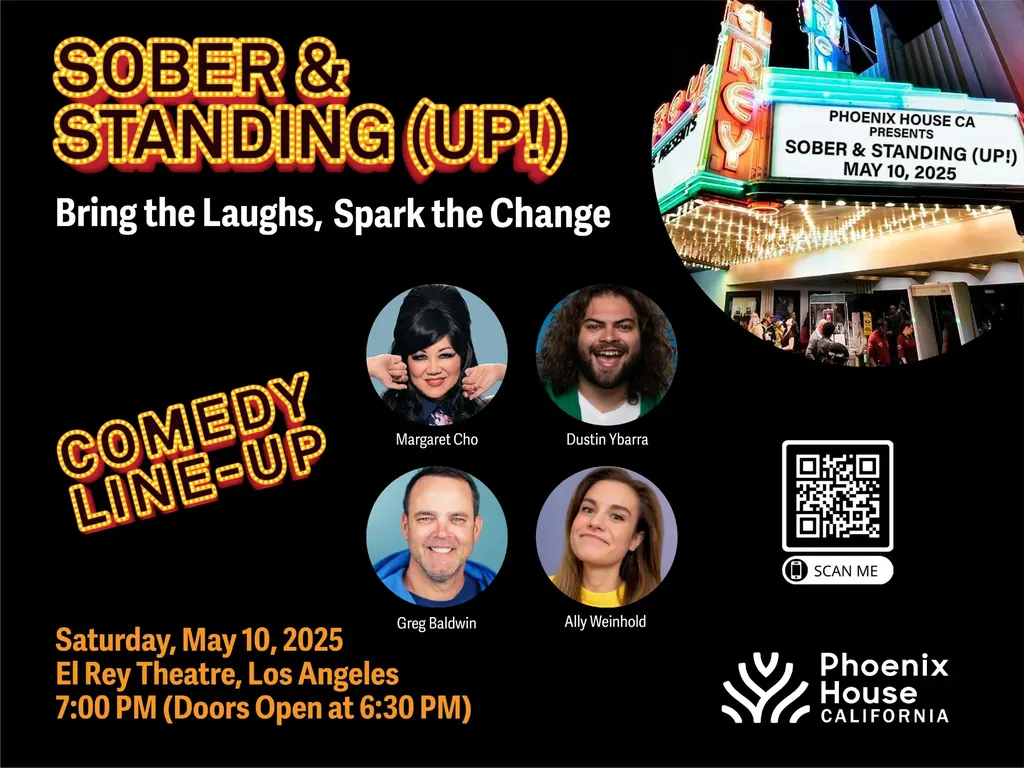 In recognition of Mental Health Awareness Month, Phoenix House California presents Sober & Standing (Up!)—a powerful evening of laughter and purpose featuring top comedians in recovery. Taking place on Saturday, May 10 at the historic El Rey Theatre in Los Angeles, the event showcases the healing power of humor with performances by Margaret Cho, Dustin Ybarra, Greg Baldwin, and Ally Weinhold. Through storytelling and stand-up, these comedians break stigma, foster connection, and raise funds to support mental health and substance use recovery for underserved communities. For tickets and details visit: phoenixhouseca.org/soberandstandingup.